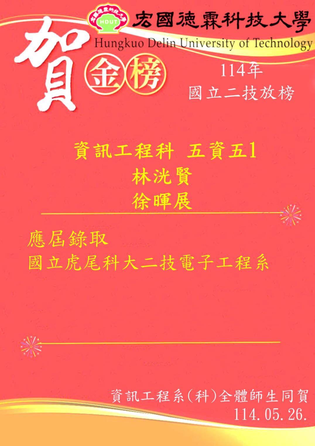 狂賀!五資五1 林洸賢、徐暉展 錄取 國立虎尾科大 電子工程系!