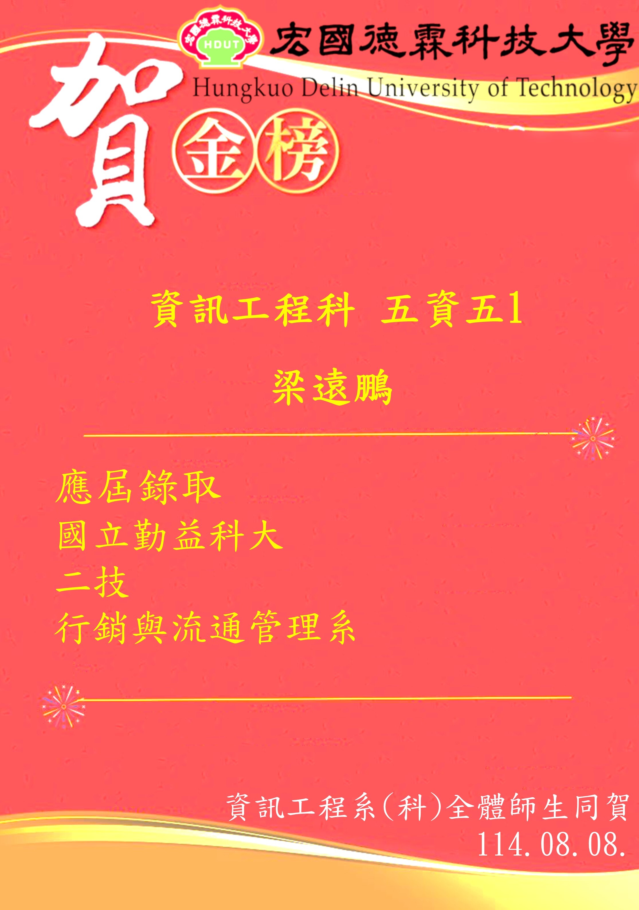 狂賀!五資五1 梁遠鵬 錄取 國立勤益科大 行銷與流通管理系!